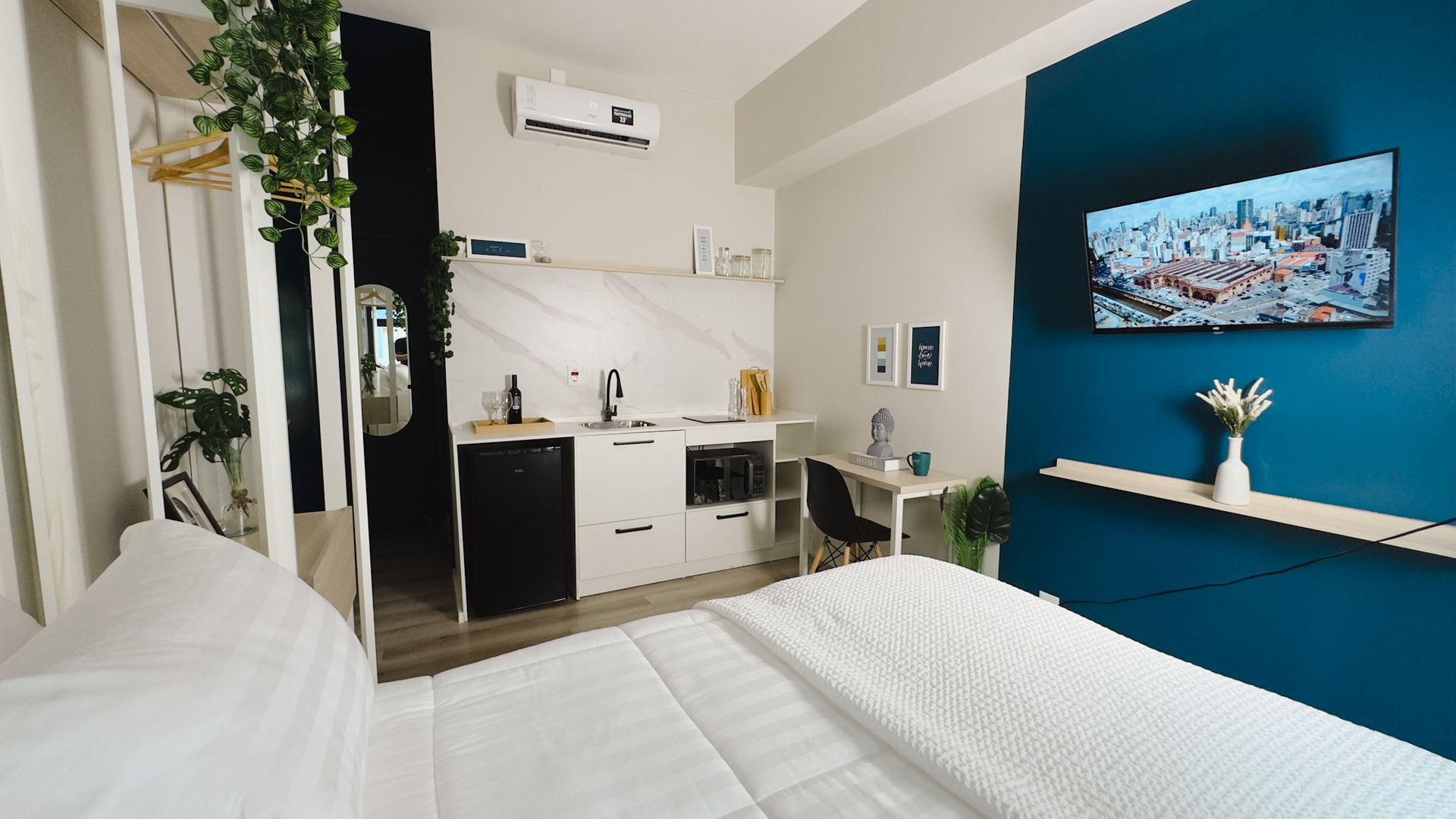 ar-condicionado, cama confortável, wi-fi, mini cozinha equipada, cabideiro, roupa de cama e banho macias, além de amenities para o seu bem-estar.