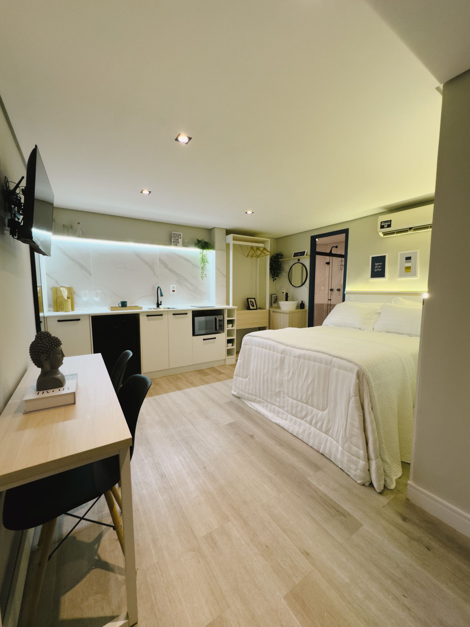 studios completos e equipados foram pensados para que você se sinta em casa, seja para uma viagem a dois, em família ou com amigos.