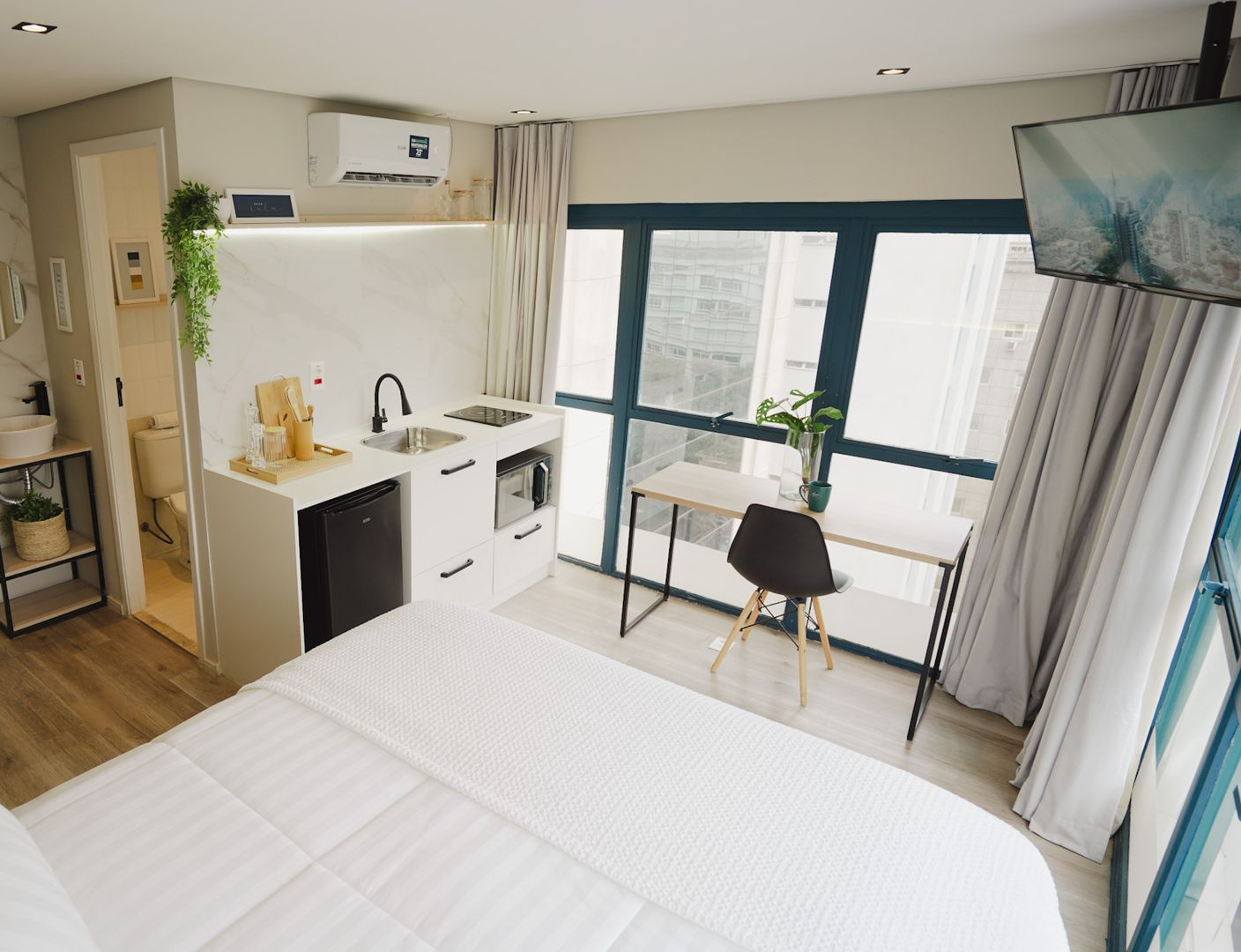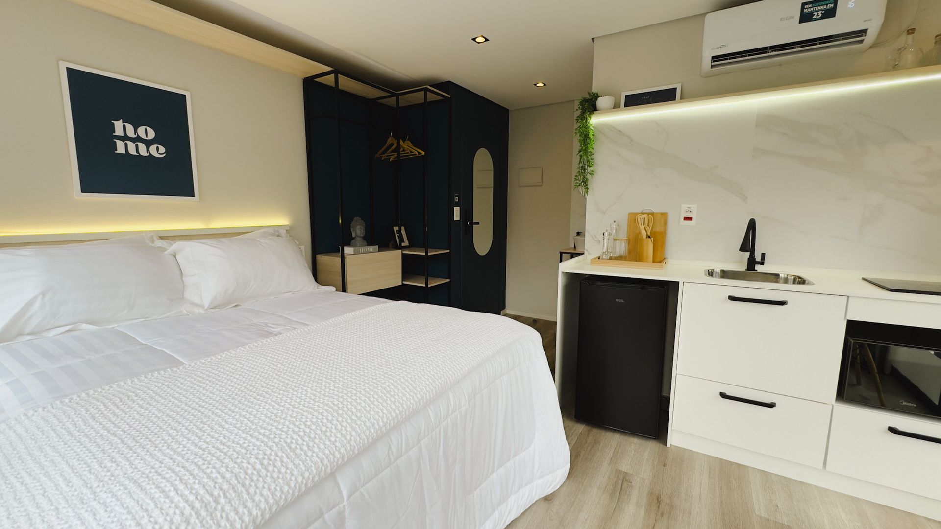 Nossos studios completos e equipados foram pensados para que você se sinta em casa, seja para uma viagem a dois ou uma estadia prática na cidade. Temos opções para até 2 pessoas, com toda a praticidade que você precisa: