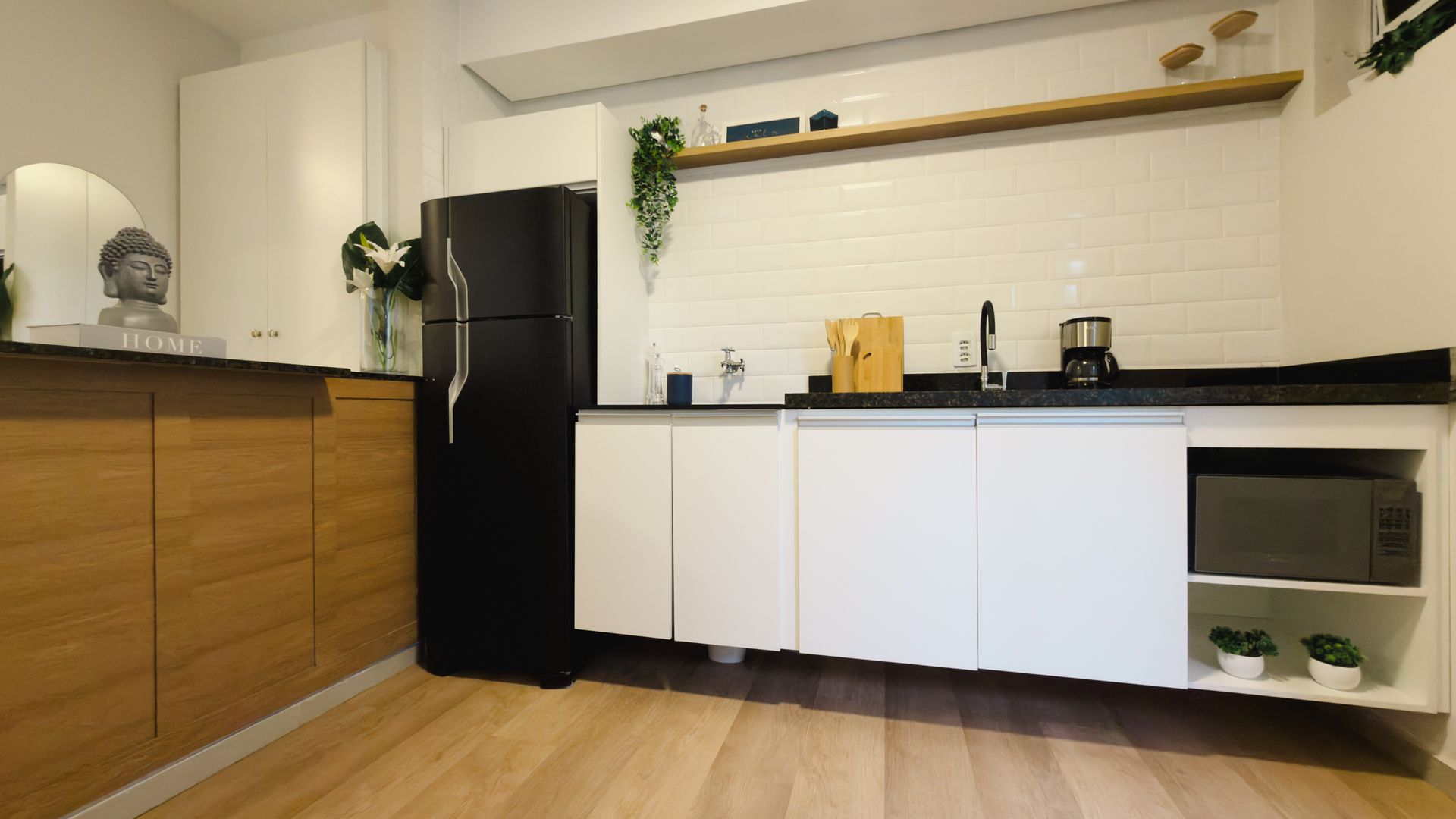 - 🍳 Mini-cozinha equipada: micro-ondas, cooktop, frigobar, talheres, pratos, copos e taças