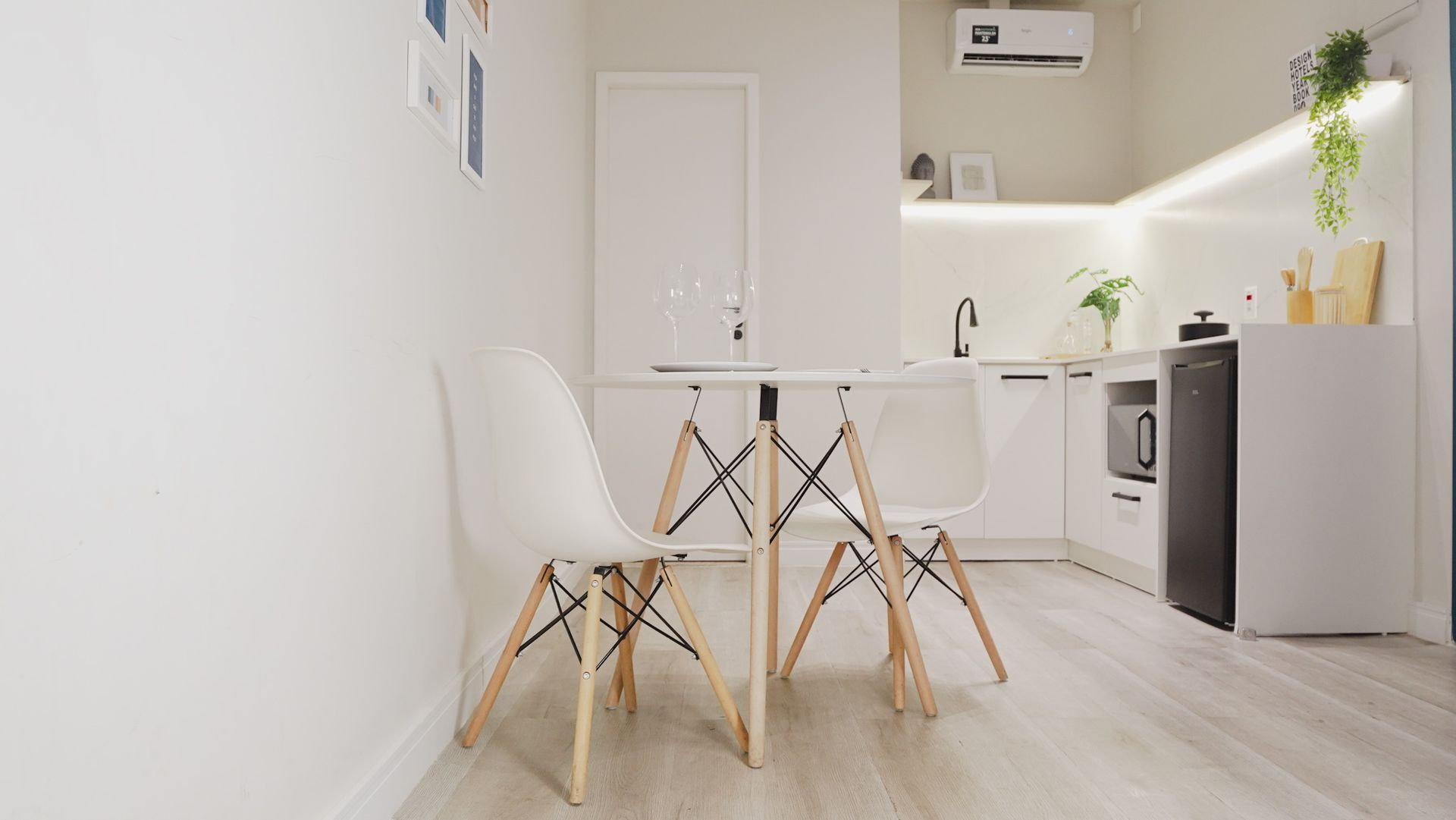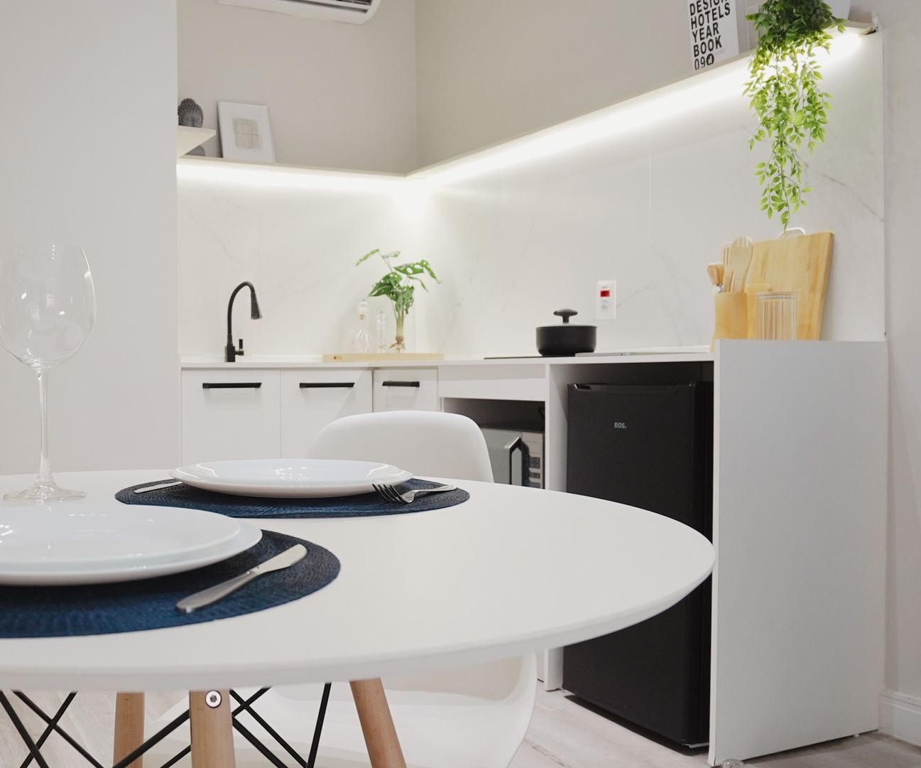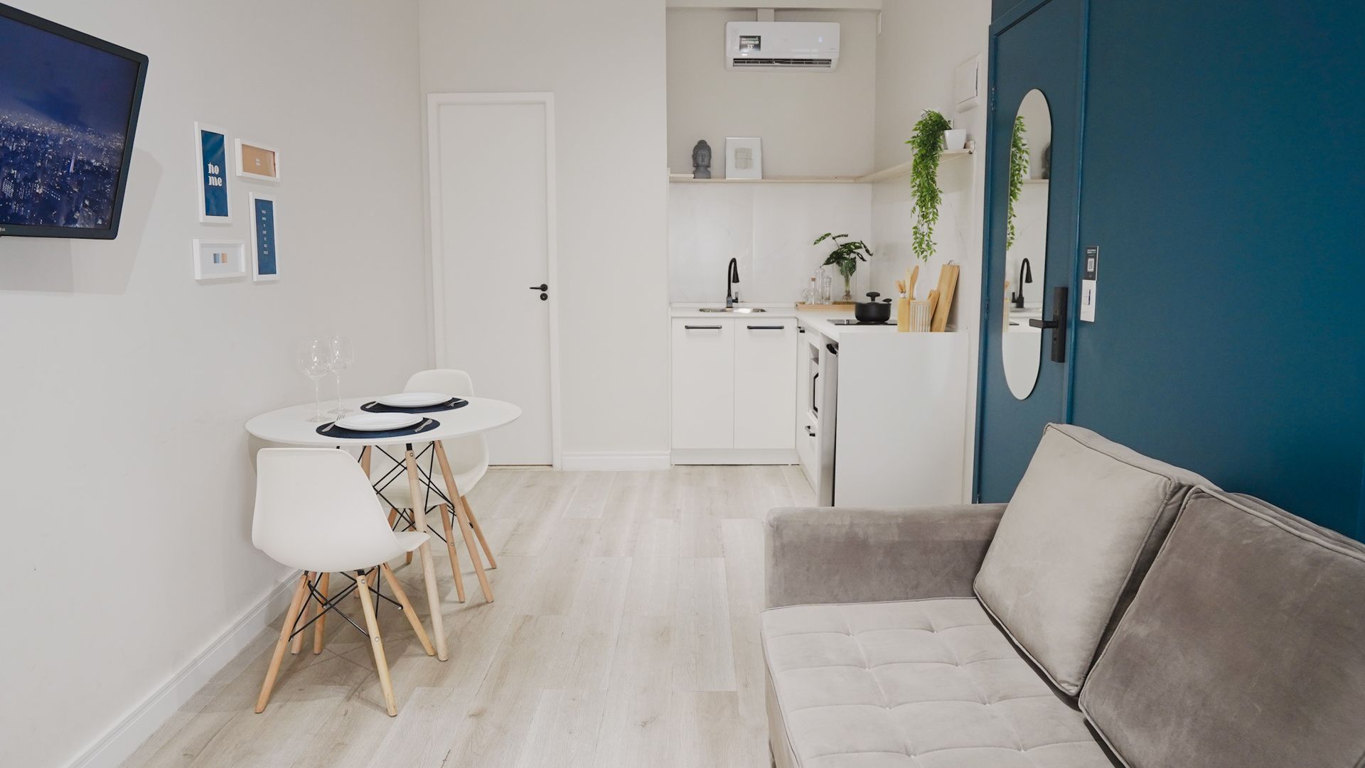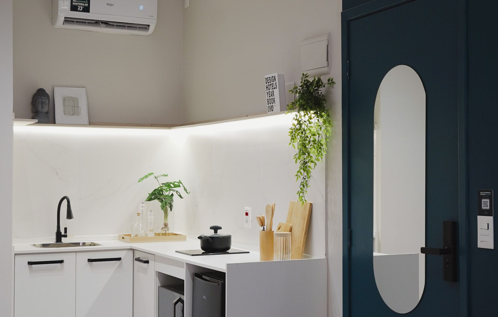 - 🍳 Mini-cozinha equipada: micro-ondas, cooktop, frigobar, talheres, pratos, copos e taças