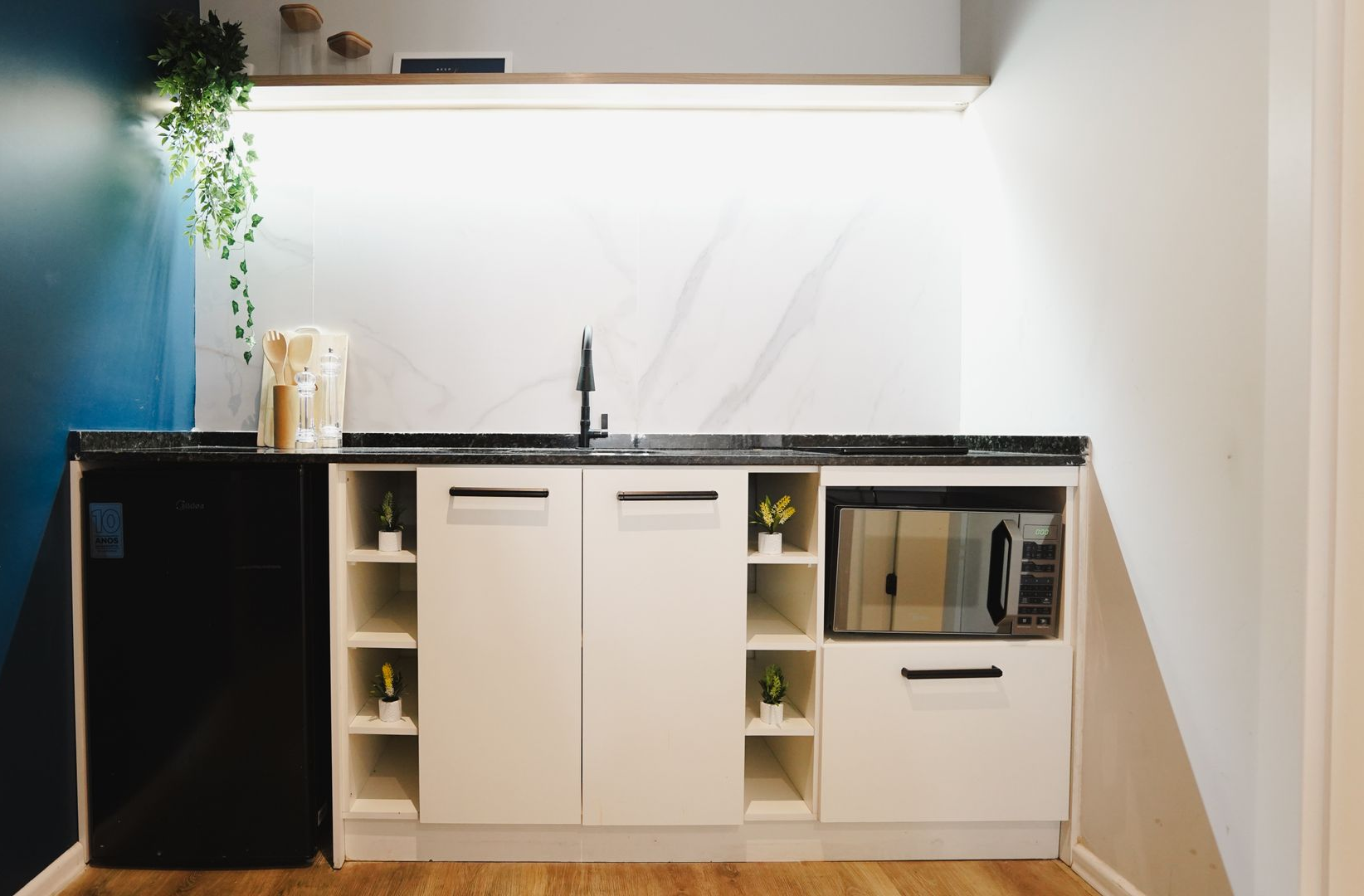 - 🍳 Mini-cozinha equipada: micro-ondas, cooktop, frigobar, talheres, pratos, copos e taças